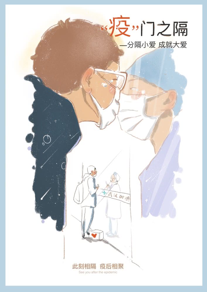 2019级工业设计专业的马微在家乡四川遂宁做抗“疫”志愿者,他创作的作品叫《众志成城 共同抗疫》。马微说:“有人在前方抗战,有人在后方努力,这才是全民抗‘疫’。”