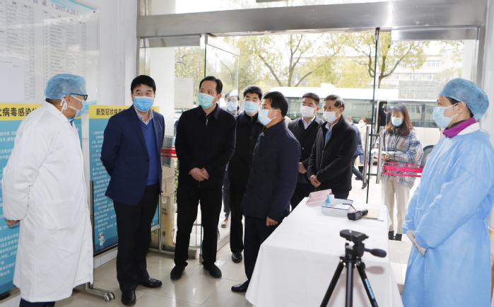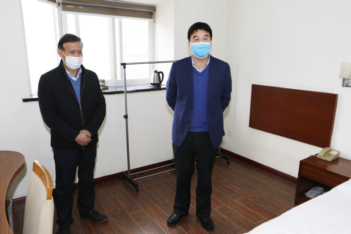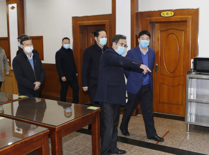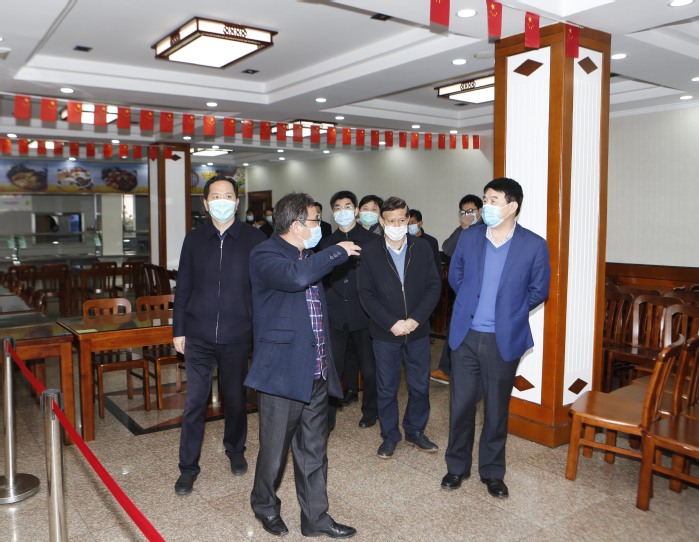 孙晓南部长一行先后来到学校医学隔离观察点、校医院、教职工餐厅、留学生宿舍等场所,察看隔离观察点准备、门诊预诊分诊制度、疫情防控物资储备等情况,了解值班教职工就餐形式,留学生宿舍管理措施,并现场听取了学校相关职能部门负责人对疫情防控工作的汇报,随后在综合楼六楼会议室开展座谈。