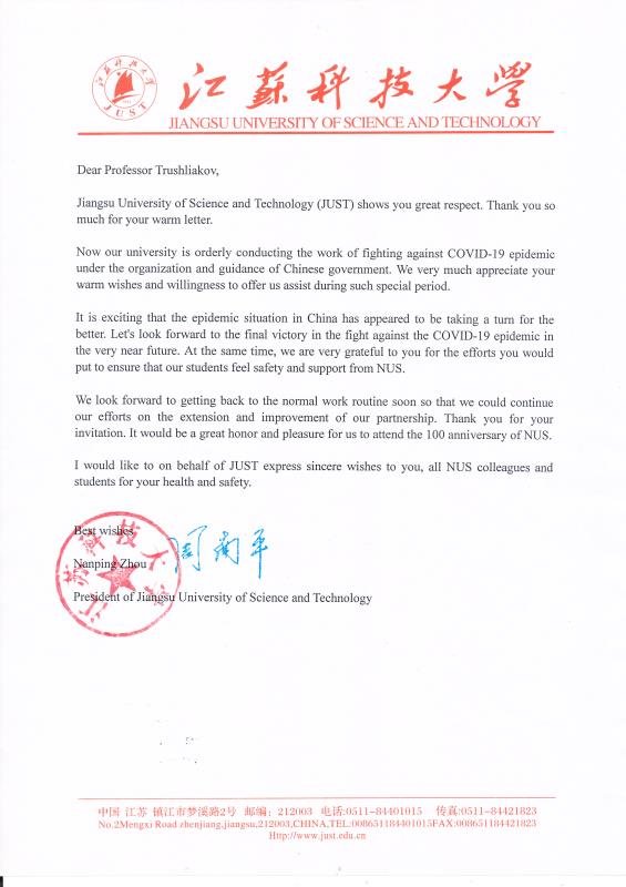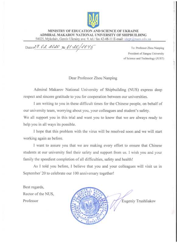 患难见真情。在我校师生全力以赴做好各项疫情防控工作之际,乌克兰马卡洛夫国立造船大学特鲁什里亚科夫校长就新冠肺炎疫情向我校周南平校长发来慰问信,传达了乌方大学对我校全体师生的关心。