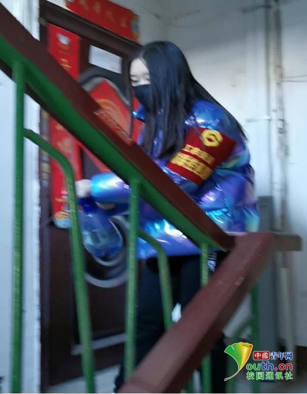 19级港口航道与海岸工程专业学生田诗熠在楼道喷洒消毒液,不放过任何一个死角。每代人有每代人的青春,每代人有每代人的征程,在不经意之间,这些逆流而上的科大船海青年志愿者们,拉起风帆,奔向了自己的征程,不论风霜雨雪,心之所向,路之所往,他们年轻的身影,是当代中国青年的使命与担当;他们年轻的臂膀,是中国精神和中国力量的生命力所在。
