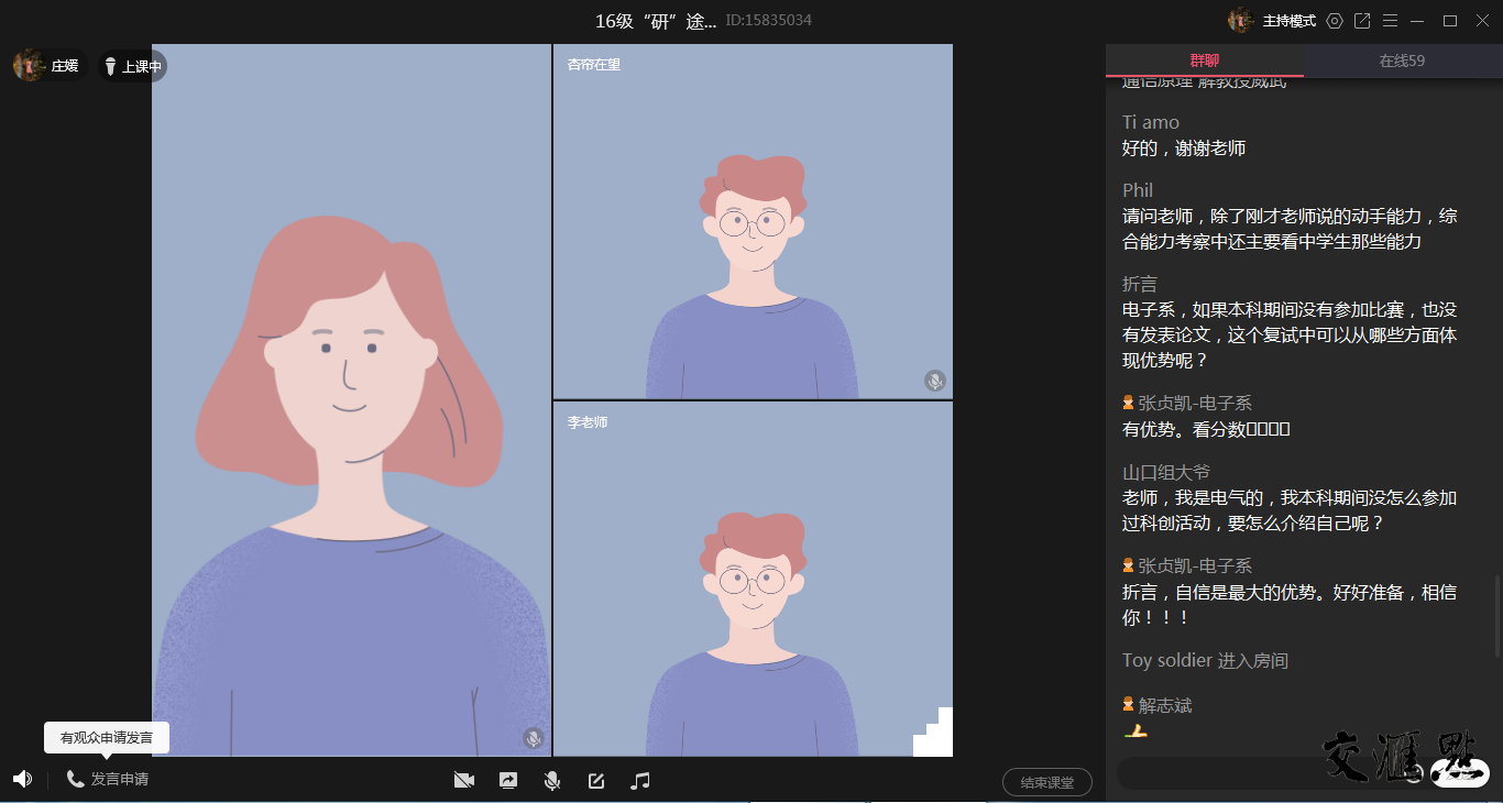 传授方法、分享经验、提问交流、解答疑惑,各学院由党政领导牵头,专业老师、辅导员积极参与,为学生开设复试指导网络直播,组织学生参加模拟面试。除各学院分管学生工作的党委副书记以外,船海学院院长窦培林、机械学院院长周宏根、经管学院党委书记王念新、理学院院长戴俊、生技学院党委书记杨美成、人文学院党委书记李明睿等院领导联合海归博士、专业老师,组成复试指导团队,从专业、学科和科研的角度帮助学生提高复试应变能力和综合素质,为考研学生“云”复试保驾护航。周宏根院长针对工科学生的特点,提出“思维敏捷”、“技术流”和“实在”等考研网络复试的三个核心“关键词”,帮助学生提高复试成功率。船海学院、经管学院、材料学院还邀请往届读研校友、复试成功同学走进直播间,为复试学子传经送宝,有效提高考研学子复试效率。