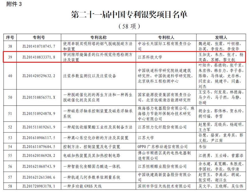 安博体育手机版王加友副校长获奖的发明专利“窄间隙焊缝偏差的红外视觉传感检测方法及装置(ZL201410833371.8)”,属于基础型专利,主要针对现有技术存在的焊缝偏差传感检测精度低、工程实用性不强等缺点,提出了一种检测精度高、环境适应能力强、适用范围宽、实用性好,特别适用于摇动(或旋转)电弧窄间隙焊缝偏差检测的红外视觉传感检测方法及装置,通过解决窄间隙熔化极电弧焊缝跟踪的共性关键技术难题,推动了摇动及旋转电弧窄间隙焊接新技术的工程应用。该专利2017年6月申请进入美国,2018年2月获得美国专利授权,其授权文本中包含11项权利要求,其中独立权利要求2项。