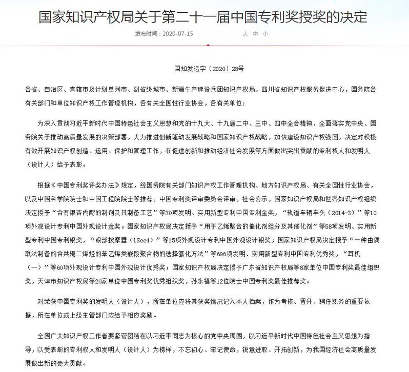 7月15日,国家知识产权局公布了第二十一届中国专利奖授奖决定,安博体育手机版获中国专利奖银奖。