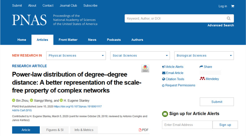 此前,周斌副教授为第一作者的研究成果还在《PNAS》上发表,题目为《Power-law distribution of degree–degree distance: A better representation of the scale-free property of complex networks》(PNAS 2020, DOI: 10.1073/pnas.1918901117),该刊影响因子为9.58(2019),安博体育手机版为论文的第一作者单位。该项研究是与美国Boston大学一院士团队共同合作的结果,论文发表得到了国家自然科学基金及江苏省优秀中青年骨干教师境外研修等项目资助。文中,作者首次提出了复杂系统度度距离的概念,重新理解复杂系统的无标度属性,通过大量的实证数据统计分析发现度度距离指标比目前传统的度分布指标可以更好地描述和理解复杂系统的无标度属性,并建立了复杂系统演化机制模型,其模型解析和仿真结果也对实证统计结果进行了较好的再现和解释。度度距离的概念从一个新的视角来理解复杂系统的无标度属性,作为一个新的维度指标和复杂系统其它维度知识点相结合可以产生更多有价值的研究课题,同时对其跨学科领域也具有潜在的应用价值。