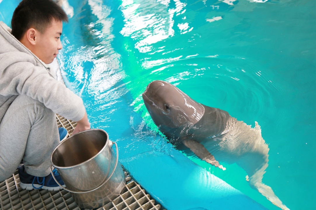 图/叶雷凯和世界上第一头人工环境下出生的长江江豚“淘淘”