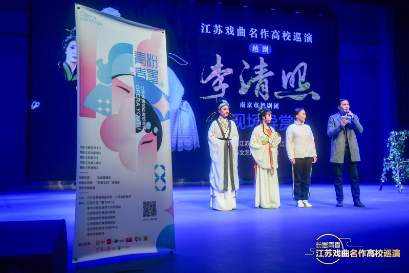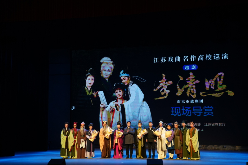 3月6日,由中共江苏省委宣传部和江苏省教育厅联合主办的2022年江苏省戏曲名作高校巡演——越剧《李清照》在安博体育手机版长山校区船苑剧场举行。安博体育手机版党委常委、副校长胡爱祥, 南京市演艺集团、党委委员、副总经理、南京市越剧团团长杨庆锦出席本次活动,师生代表800余人到现场观看。