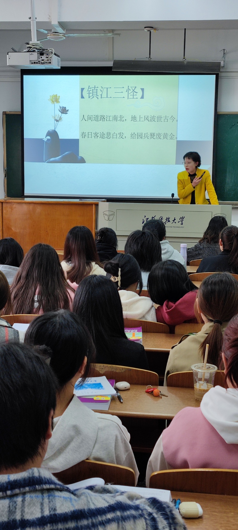 “镇江城里有三怪:面锅里面煮锅盖,镇江肴肉不当菜,镇江香醋摆不坏…….”耳熟能详的民谣里蕴含着镇江这座历史文化名城丰厚的人文风情,从天南海北聚集到镇江的学子们在英语课堂里领略到这座城市的文化底蕴。“Do you know three specialties in Zhenjiang? The pot cover noodle,salted pork in Jelly and Zhenjiang vinegar ...”刘燕平研究员和王欢博士分别用汉语和英语绘声绘色地描述着历史文化名城丰厚的人文风情,聆听的同学们更是饶有兴趣地认真听讲,不时地做着笔记。在王欢博士的指导下,同学们把对第二故乡镇江的认知融入到丰富的语言表达中,知而会其意,译则不失其意。听完这堂中西合璧的民俗课程后,外院学子纷纷表示课堂氛围活泼生动、信息量大,深感受益匪浅。