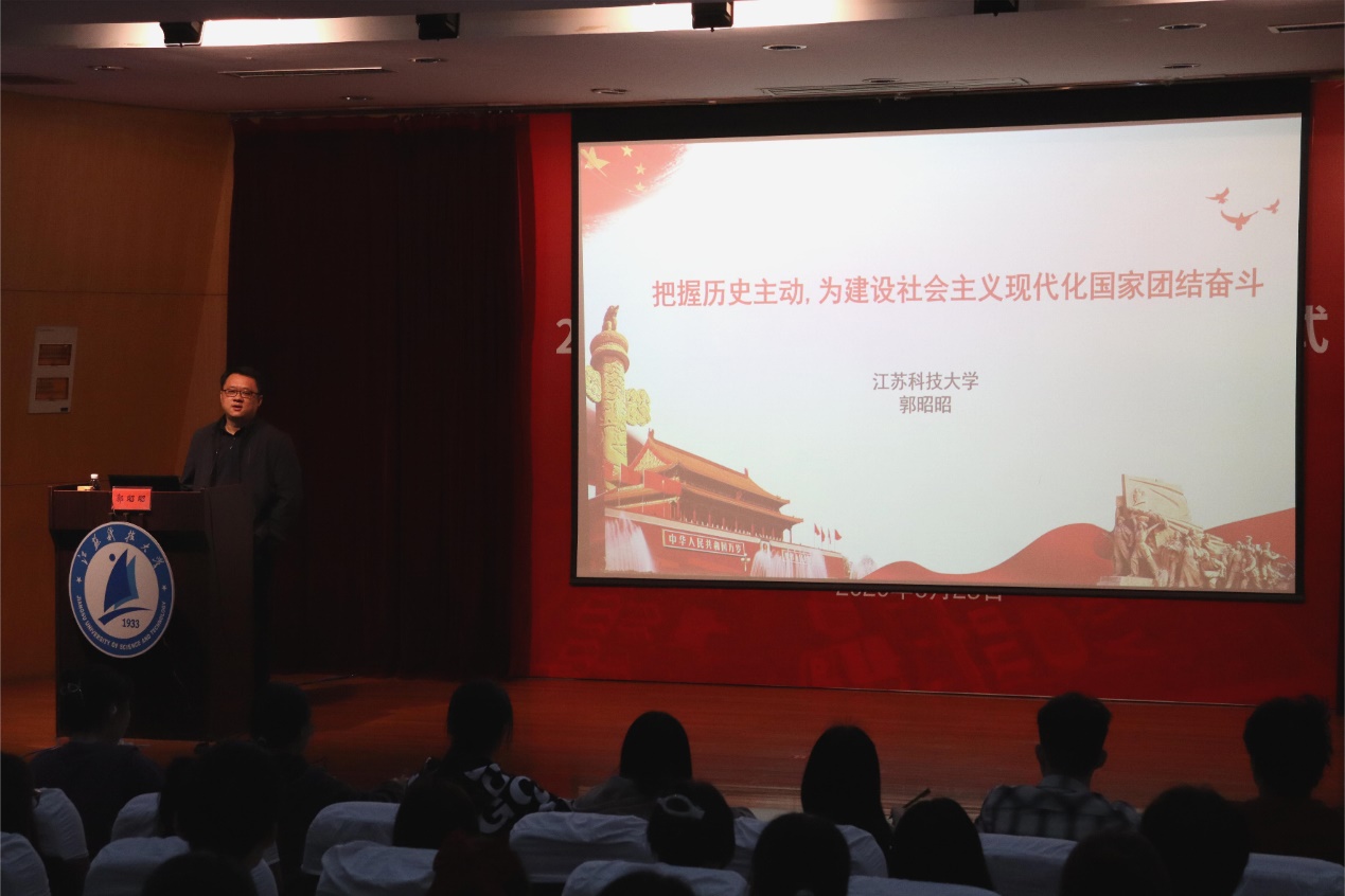为深入学习宣传贯彻党的二十大精神,解决青年大学生关于党的二十大报告怎么学、学什么、怎样与具体实际相结合等问题,4月13日下午,深蓝学院邀请我校马克思主义学院党总支书记郭昭昭研究员在梦溪校区学术报告厅开展以“把握历史主动,为建设社会主义现代化国家团结奋斗——深入学习党的二十大精神”为主题的2022级新生转型教育课第十六讲。本次课程由深蓝学院党总支副书记秦向荣主持,以线上线下相结合的形式开展,深蓝学院部分教师和新生代表200余人在现场听讲,其他师生在教室同步学习。