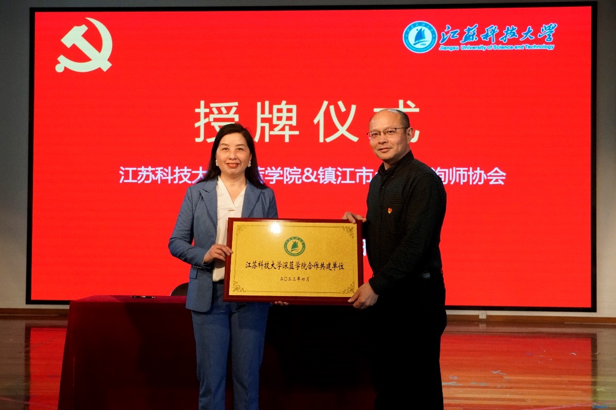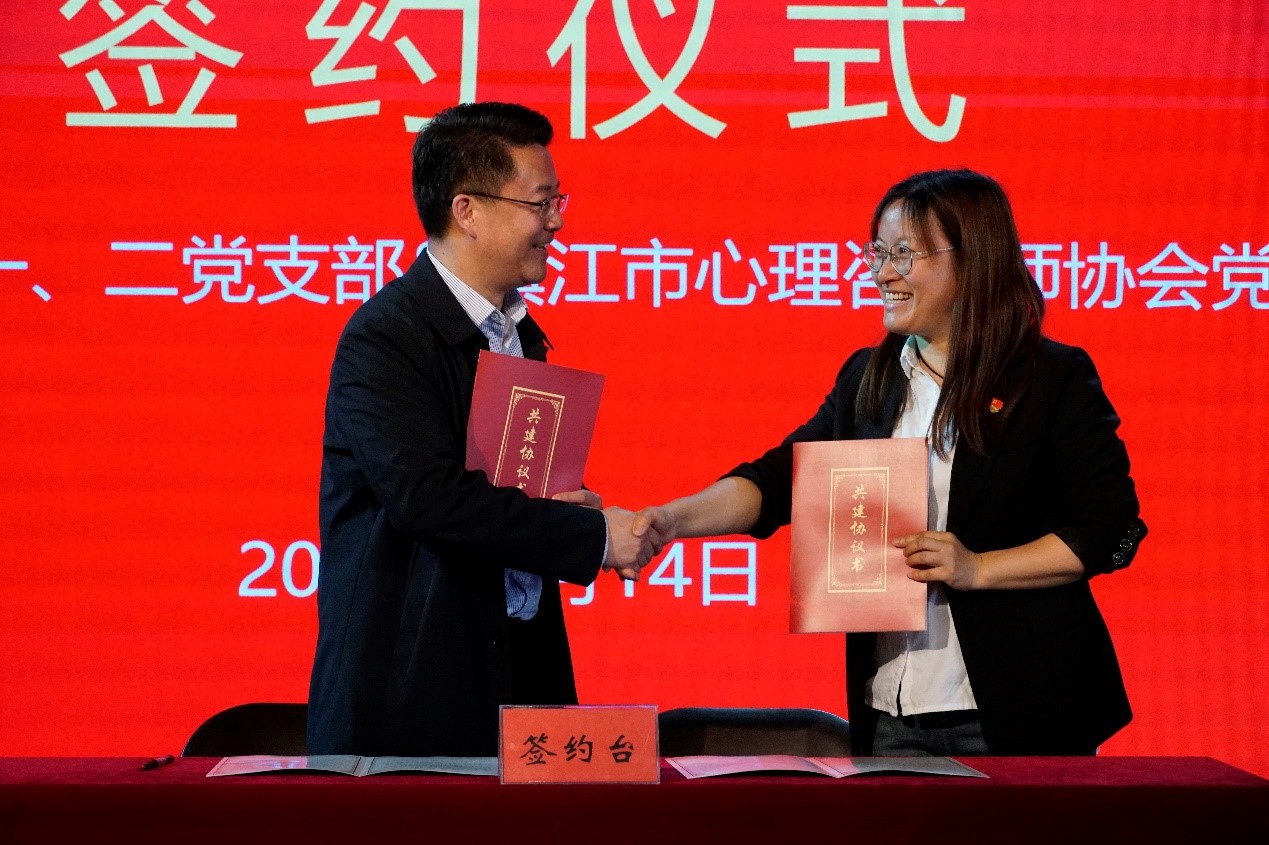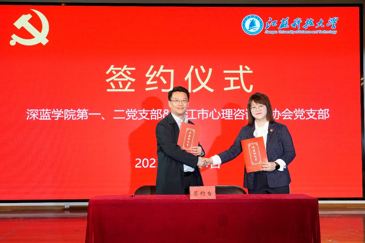 深蓝学院第一党支部书记杜伟伟,第二党支部书记何筠分别与镇江市心理咨询师协会党支部书记钱宇平签订《共建协议书》,杨建超和林霞共同上台授牌,并就双方深度合作达成共识。双方一致表示,在共建期间会充分发挥各自的优势,以党建引领,互相促进、共同提高,携手并进,全力提升高校学子的心理健康水平。