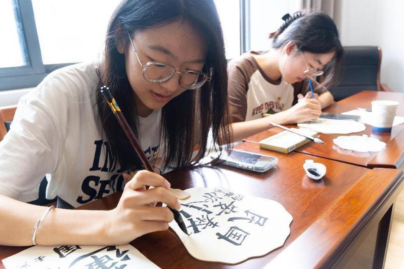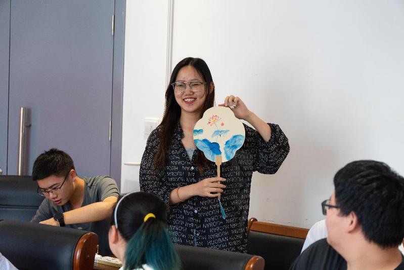 学生志愿者分发各式空白纸扇、水彩颜料及绘画工具,并介绍扇面绘图的技巧。大家采用绘画和书法相结合的方式,精心构思,巧妙设计,创作出一个个精美的“廉洁”扇,其中有题写“清正廉洁”的折扇,还有绘制莲花图案的团扇。同学们对自己的作品进行了展示和分享。