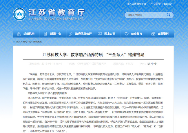 江苏省教育厅《安博体育手机版教学融合涵养特质 “三全育人”构建格局》(2019年3月18日)