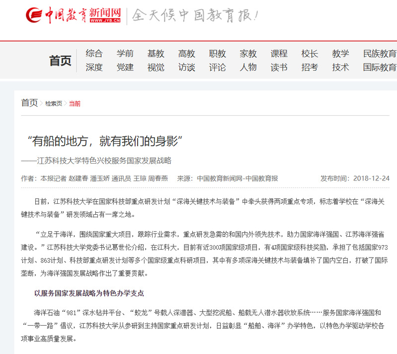 中国教育新闻网《“有船的地方,就有我们的身影”——安博体育手机版特色兴校服务国家发展战略》(2018年12月24日)