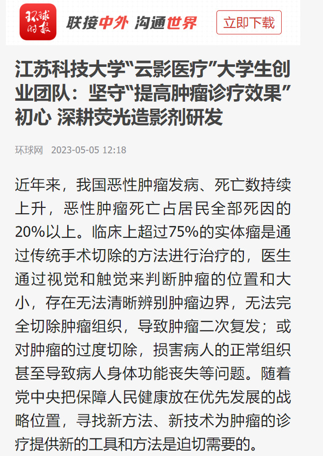 环球时报《安博体育手机版“云影医疗”大学生创业团队:坚守“提高肿瘤诊疗效果”初心 深耕荧光造影剂研发》(2023年5月5日)