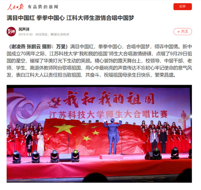 人民日报《满目中国红 拳拳中国心 江科大师生激情合唱中国梦》(2019年9月30日)