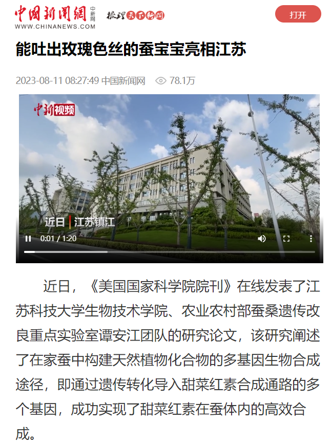 中国新闻网《能吐出玫瑰色丝的蚕宝宝亮相江苏》(2023年8月11日)