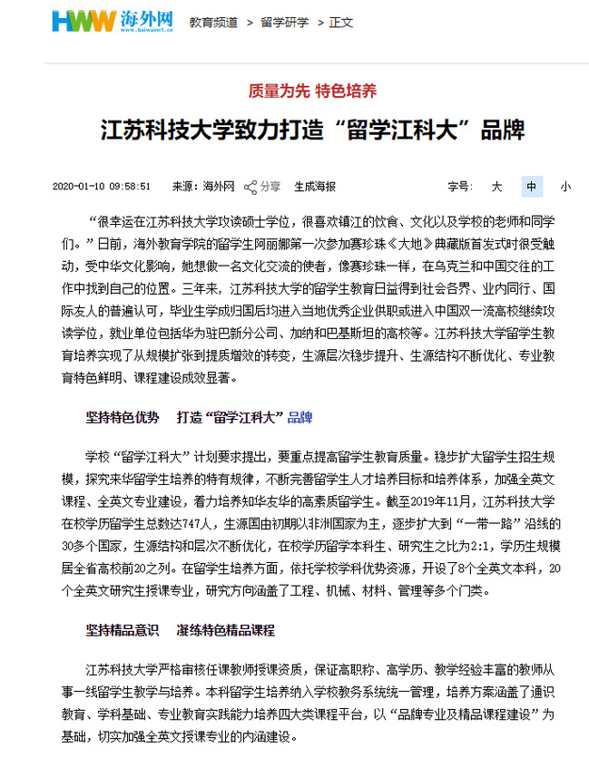 人民日报(海外网)《安博体育手机版致力打造“留学江科大”品牌》(2020年1月10日)