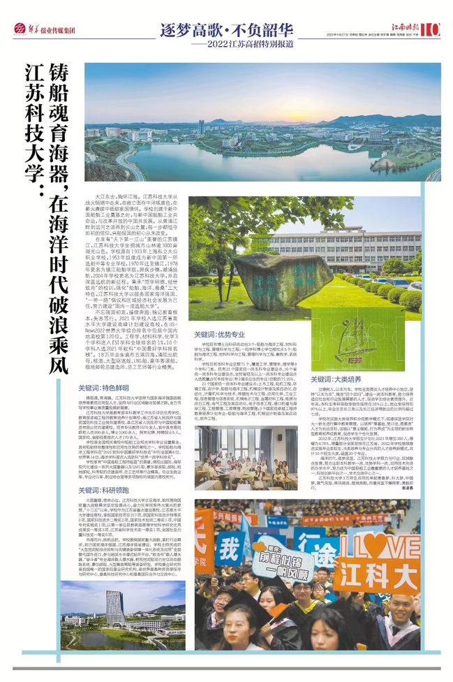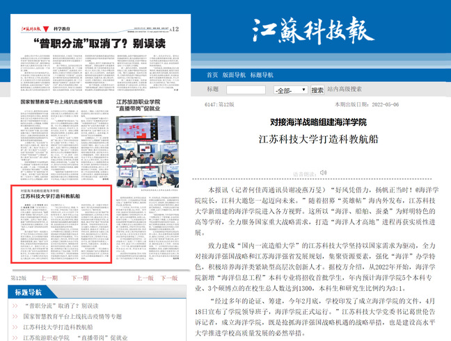 江苏科技报《对接海洋战略组建海洋学院 安博体育手机版打造科教航船》(2022年5月6日)