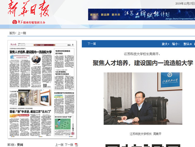 新华日报《安博体育手机版校长周南平:聚焦人才培养,建设国内一流造船大学》(2019年12月27日)