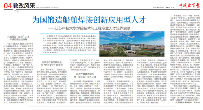 中国教育报《为国锻造船舶焊接创新应用型人才——安博体育手机版焊接技术与工程专业人才培养实录》(2022年9月26日)