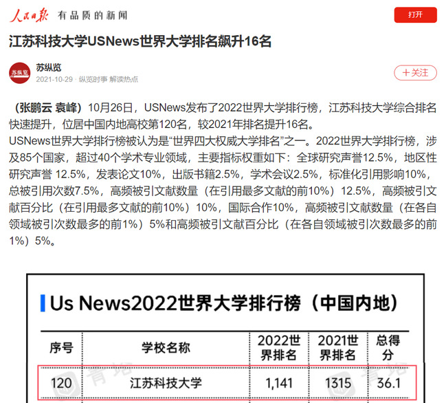 人民日报《安博体育手机版USNews世界大学排名飙升16名》(2021年10月29日)