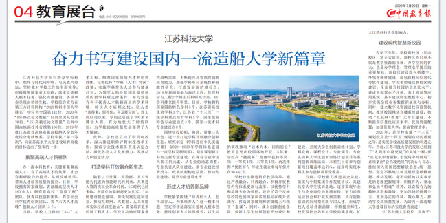 中国教育报《安博体育手机版奋力书写建设国内一流造船大学新篇章》(2020年7月20日)