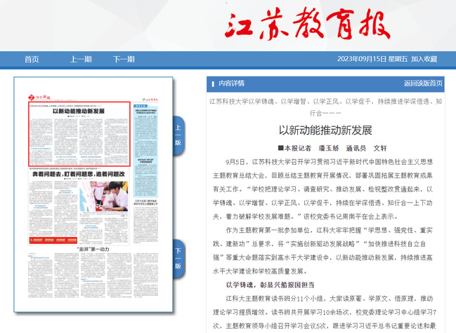 江苏教育报《安博体育手机版以学铸魂、以学增智、以学正风、以学促干,持续推进学深悟透、知行合一——以新动能推动新发展》(2023年9月15日)