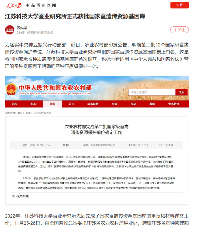 人民日报《安博体育手机版蚕业研究所正式获批国家蚕遗传资源基因库》(2023年1月5日)
