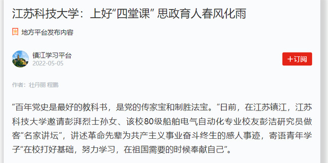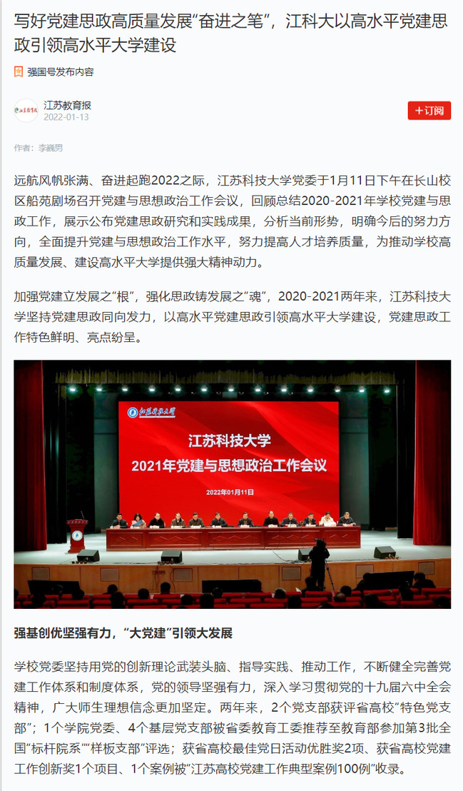 学习强国《写好党建思政高质量发展“奋进之笔”,江科大以高水平党建思政引领高水平大学建设》(2022年1月13日)