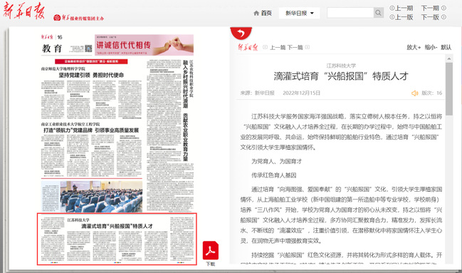 新华日报《安博体育手机版滴灌式培育“兴船报国”特质人才》(2022年12月15日)