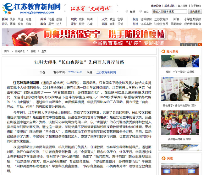 江苏教育新闻网《江科大师生“长山夜漫谈”先问西东再行前路》(2020年12月16日)