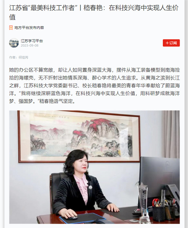 学习强国《江苏省“最美科技工作者”丨嵇春艳:在科技兴海中实现人生价值》(2023年9月8日)