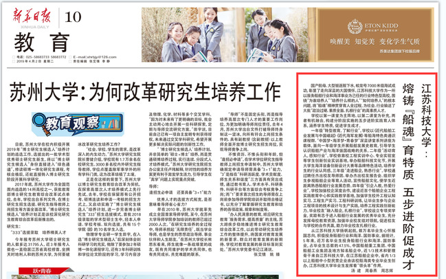 江苏教育报《新工科理念下船舶机械类人才数字化交融培养模式的探索与实践》(2021年2月3日)