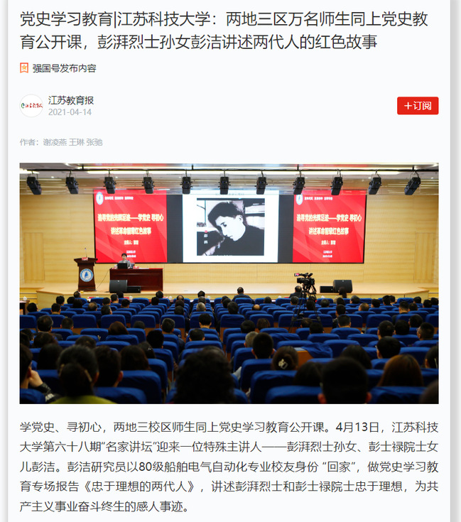 学习强国《党史学习教育|安博体育手机版:两地三区万名师生同上党史学习教育公开课,彭湃烈士孙女彭洁讲述两代人的红色故事》(2021年4月14日)