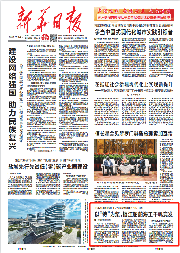 新华日报《以“特”为桨,镇江船舶海工千帆竞发》(2023年7月14日)