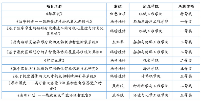 我校于2022年7月启动本届竞赛的备赛工作。在学校党政领导与支持下,校团委与各学院联动,全校师生积极参与项目选拔推荐;校团委发挥团组织服务力、保障力,从赛事伊始,围绕项目培育提升、材料完善细化、后勤服务保障,为参赛师生提供全方位支持和指导。校内选拔赛参赛作品涵盖机械控制、信息技术、能源化工、生命科学以及哲学社会科学类社会调查报告等诸多领域。在“红色专项活动”中,机械工程学院项目《黔茶说》获国赛特等奖。在“揭榜挂帅”专项赛中,船舶与海洋工程学院项目《洁净行者——领跑管道清淤机器人新时代》和机械工程学院项目《基于数字孪生的船舶分段建造车间可视化监控与仿真优化系统》获国赛一等奖,船舶与海洋工程学院项目《基于最优区域划分的多智能体协同覆盖路径规划算法》、粮食学院项目《智监虫霉》获国赛二等奖,计算机学院项目《基于视觉图像的大尺寸钢板切割精细引导系统》和海洋学院项目《基于雷达RCS数据的空间物体智能识别技术研究》获国赛三等奖。在主体赛中,船舶与海洋工程学院项目《面向船舶复杂异形分段的九轴联动智能涂装系统》获国赛二等奖。在“黑科技”专项赛中,材料科学与工程学院项目《厚积薄发——高可靠大容量X5R层积型电容器瓷介材料》获国赛二等奖,环境与化学工程学院项目《清凉计划——热致变色节能环保智能窗》获国赛三等奖。