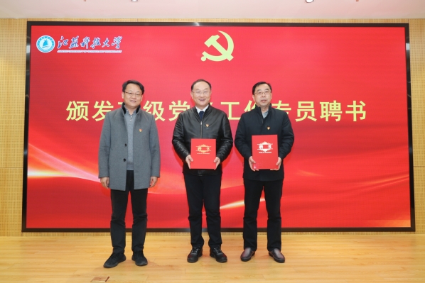 周南平书记为“深蓝高端人才”党支部授旗、赠送图书,并发表重要讲话。他指出,坚持党管人才原则,牢固树立“人才是第一资源”理念,大力实施人才强校战略,始终把人才工作作为关系学校未来发展的大事要事来抓。最后,周南平书记对人才工作提出四点期望:一是党管人才,筑牢真心聚才的“向心力”,加强对人才工作的政治引领,全方位支持人才、帮助人才,千方百计造就人才、成就人才,让江科大真正成为青年人才茁壮成长、高端人才纷至沓来的新高地;二是广开贤路,汇聚诚心引才的“强动能”,持续加大学科带头人和方向带头人的引进和培育力度,建立健全高层次人才柔性引进机制,通过互聘、联聘、多聘等形式聘用高校、行业、企业的高层次人才服务学校学科发展,让江科大成为人才理想之地;三是创优环境,厚植悉心育才的“新沃土”,用实际行动在全校营造尊重知识、尊重人才的浓厚氛围,才能聚人气、增人才、得人心,让各类人才真切地感受到“江科大就是你,你就是江科大”;四是真情关爱,打造贴心爱才的“服务圈”,重视解决人才面临的实际困难,做人才的“贴心人”和“暖心人”,让人才想创新有开放的平台,谋发展有多元向上的通道,出成果有名利双收的激励,遇困难有周到暖心的回应,构建人才成长发展“一条龙”服务。