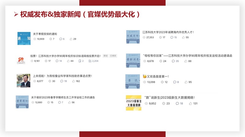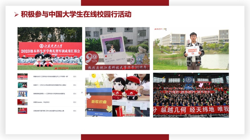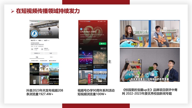 安博体育手机版党委宣传部融媒体中心依托“1+6”(1个新闻中心加官方微博、官方微信、官方抖音、官方B站、学习强国号、中国大学生在线校园号)新媒体育人阵地,借助融媒体传播优势,立足校园生活、讲好科大故事,打造网络思政工作新格局。2023年,“安博体育手机版”官方微信共发布推文400+篇,总共阅读量262万+;微博共发布450+条,浏览量777万+,创作出《校园里的宝藏up主》《考研学霸宿舍》等一系列兼具创意性、感染力的原创作品;新媒体新闻专题《省高校首家!江科大这门宝藏课程藏不住啦……》获“2022年度江苏教育新闻奖”;微信公众号作品《江科大,是……?》获第二十七届船舶新闻奖。联动线上线下,打造全员参与、全面覆盖、全方位辐射的思政育人体系,融媒体中心参与毕业典礼、办学90周年晚会等学校大型活动,精心策划校庆灯光秀、证件照摄影棚等系列广受欢迎的线下活动;统筹开展“安博体育手机版校园文化创意大赛”“全国大学生网络文化节”“世界读书日主题征文比赛”等活动;组织开展2023年度江苏省高校网络思政“金微课”征集评选、江苏2023“五个一批”网络精品征集评选展播等活动,引导广大师生积极参与网络产品的创作生产,让网络思政教育有声有色、入耳入心。