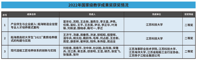 7月24日,教育部公布《教育部关于批准2022年国家级教学成果奖获奖项目的决定》(教师〔2023〕4号)。安博体育手机版《产业伴生与企业嵌入:船海制造业信管专业人才培养模式重构》《船海类高校大学生“1621”素质培养模式的构建与实践》等2项成果喜获高等教育(本科)国家级教学成果奖二等奖,学校作为第二完成单位参与的成果《现代造船工匠培养体系的创新与实践》喜获职业教育国家级教学成果奖二等奖。实现学校国家级教学成果奖历史性突破。国家级教学成果奖每四年评选一次,此次获奖是学校高质量发展和高水平大学建设的重大标志性成果。学校将以此次获奖为契机,激励广大教师投身教学研究与实践,进一步深化教育教学综合改革,推动高质量发展,实现高水平大学建设目标。