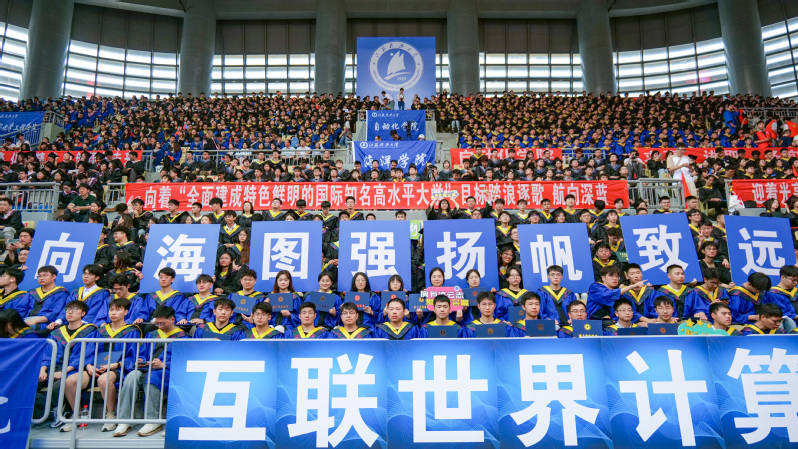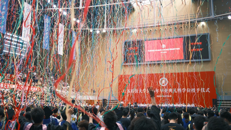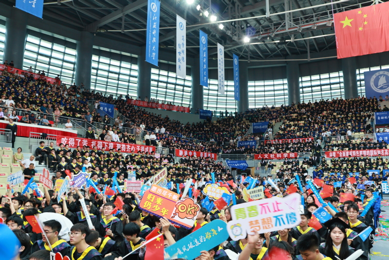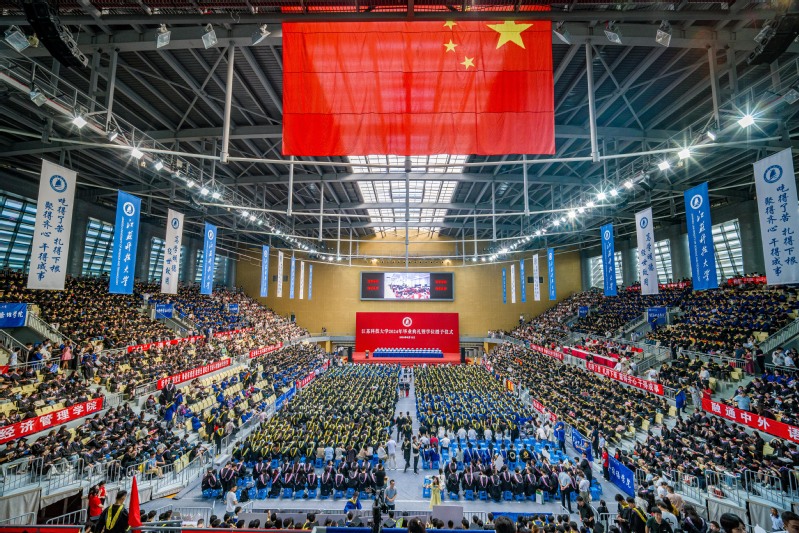 8点30分,在激昂雄壮的国歌声中,毕业典礼盛大启幕。主会场设镇江大学城共享体育馆,张家港校区设视频分会场。学校在官方微信视频号、B站、抖音、微博等平台同步直播,师生校友“云端”相聚,共同见证青春荣光。