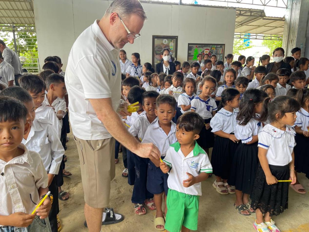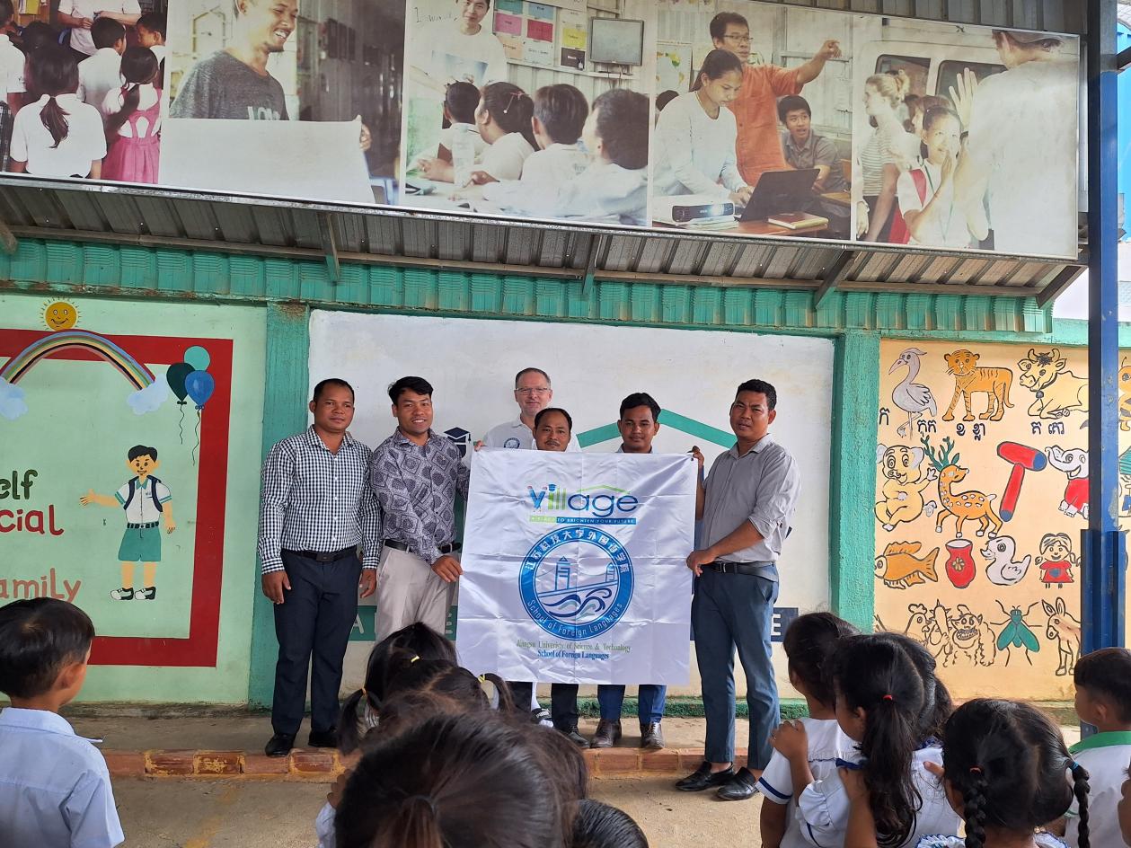 自2014年起,Mark老师每年都利用暑期前往柬埔寨的The Village of English进行支教活动,近几年也带去江科大外国语学院的爱心与帮扶。他们不仅教授孩子们英语,还融入当地的教师提升与发展。在柬埔寨期间,Mark老师还通过各种语言互动和文化交流活动,促进中柬两国的民间友谊,也通过介绍江科大的船舶、海洋、蚕桑特色,助力扩大学校的国际美誉度和影响力。