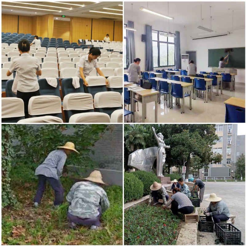 在酷热的天气里,后勤干部职工们各司其职,忙碌而有序,为约7000名留校师生的学习、生活和科研保驾护航。饮服中心开放5个餐厅,员工们在高温的厨房里挥汗如雨,精心准备每一份餐食,确保留校师生的饮食安全与营养健康。公寓中心不仅负责14个开放组团日常的值班与清洁工作,还提前为7129名新生入住做好充分的准备,从打扫房间到安排床位,每一项工作都细致入微。物业中心在做好所有开放办公楼、教学楼、图书馆等场所的物业服务的基础上,还完成大学生劳动基地日常管护、桑树修剪,并为学校各类比赛活动、会务等提供服务保障近70场次,同时加强防汛防台工作,确保校园环境的整洁与安全;校园管理科协调合作单位完成了草花补植、草坪铺设、抗旱浇水、病虫害防治、草坪除草、色块修剪等工作。