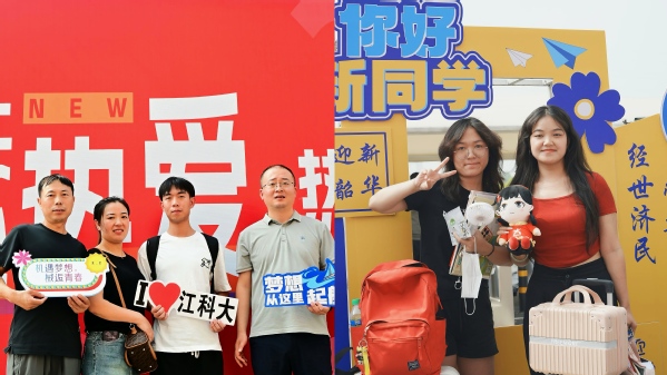 迎着晨曦,两校区迎新现场热闹非凡,随处可见满满的仪式感。“欢迎你 2024级新同学”“你好江科大的新主人”……道旗、条幅、展板、立标、拱门、地贴等氛围感十足,为新生们带去无声的归属感。新生和家长纷纷打卡留念,用快门定格校园生活的开始,留下珍贵的入学记忆。