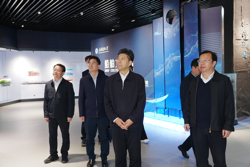 随后,校党委书记周南平,党委常委、副校长潘锦全,党委常委、纪委书记、监察专员安祥卫陪同曲福田一行参观了学校船舶文化馆。曲福田一行了解了我国的古船、民船、海洋工程船舶、军船以及船舶海工大国重器的发展历程,特别是由学校参与设计建造的代表船型情况,听取了世界船舶技术产业未来发展方向的介绍。