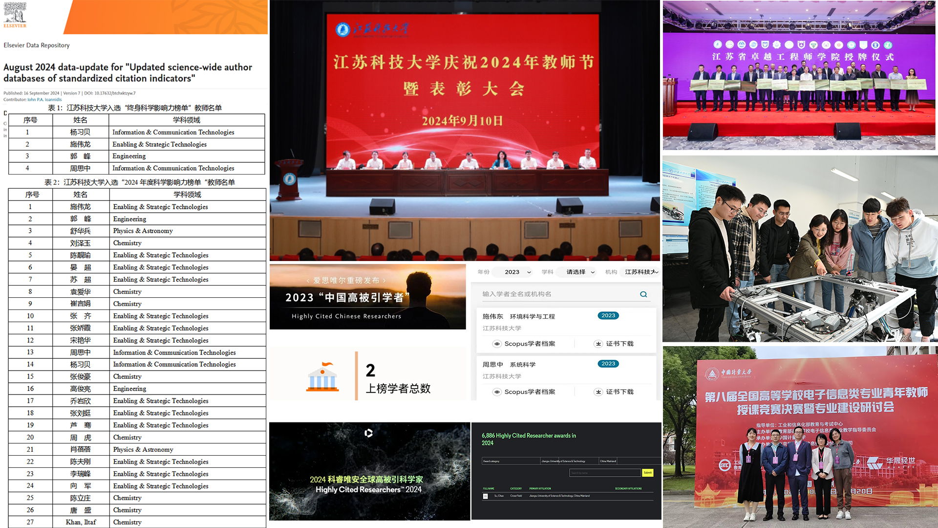 学校建强师资队伍,在第40个教师节到来之时,召开庆祝2024年教师节暨表彰大会,激励全体教职工投身教育强国建设,1名教师获评全国优秀教师。高层次人才引育并举,召开海外引才工作小组会议,开展海外人才座谈会,营造高层次人才快速成长良好氛围。27位学者入选2024年全球前2%顶尖科学家榜单,1人荣登 2024年度“全球高被引科学家榜单 ”,2人入选爱思唯尔2023“中国高被引学者”榜单。在第四届全国高校教师教学创新大赛中,我校推荐省赛的教师团队全部获奖,其中获省赛特等奖4项(含新教师赛道特等奖),学校获省赛优秀组织奖;在国赛中,两支团队勇夺全国一等奖,实现历史性突破;我校“四维驱动,聚力打造卓越本科教学”案例也成功入选江苏省高校教师教学发展典型案例;1名教师获第8届全国高等学校电子信息类专业青年教师授课竞赛全国一等奖。九三学社江科大委员会2名社员分别被表彰为社会服务先进个人和全国宣传思想工作先进个人。