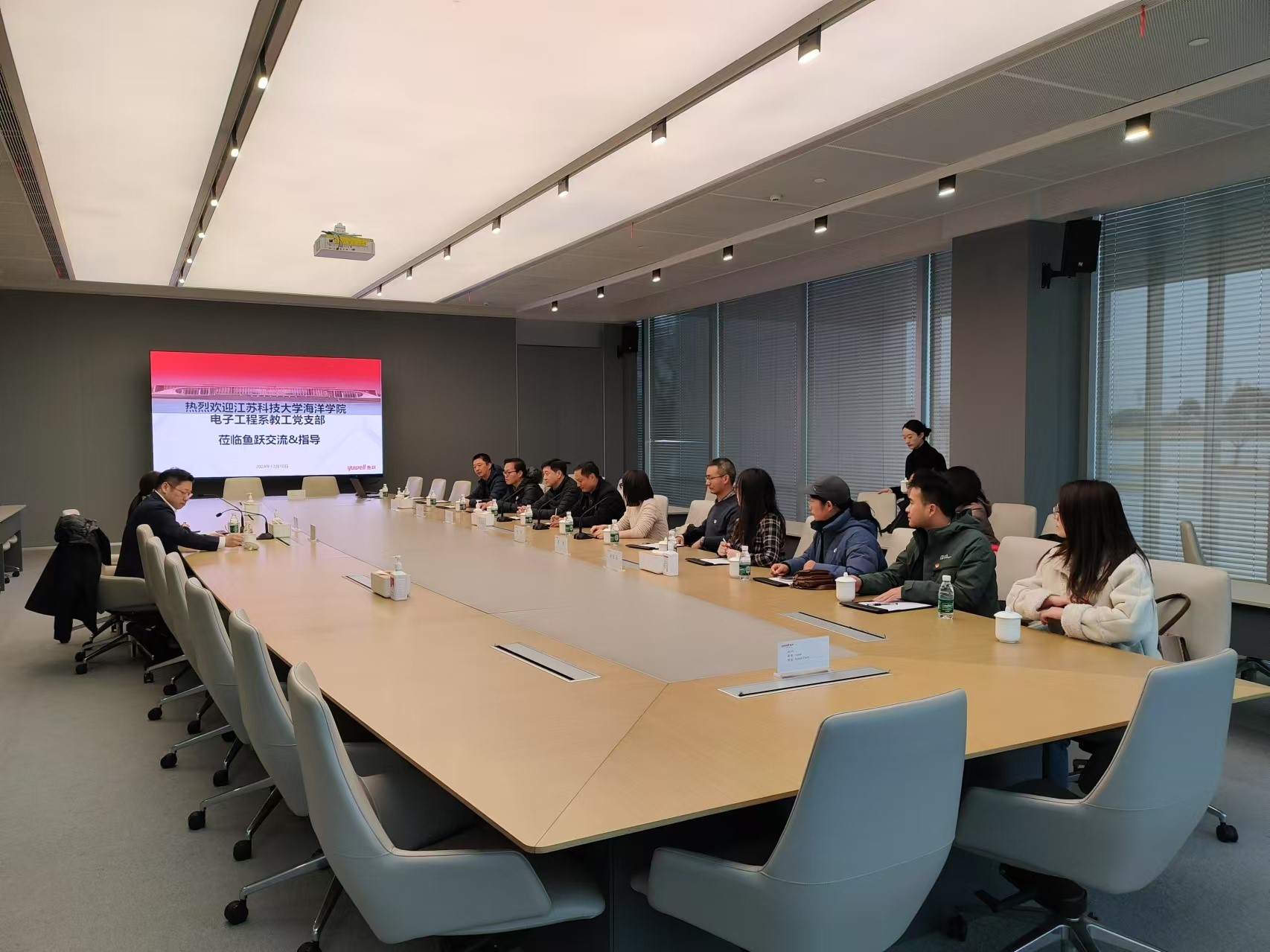 海洋学院党委委员、副院长张贞凯、海洋学院党委委员苏胤杰、电子工程系教工党支部书记罗浩,江苏鱼跃医疗设备股份有限公司袁振副总经理、行政运营党支部书记束雅娟以及电子工程系党员教师参加了此次活动。此次党支部共建活动,旨在加强双方在党建工作、人才培养、科技创新等方面的交流与合作,进一步强化校企之间的合作关系,共同探索新时代背景下高等教育与产业发展的新路径。