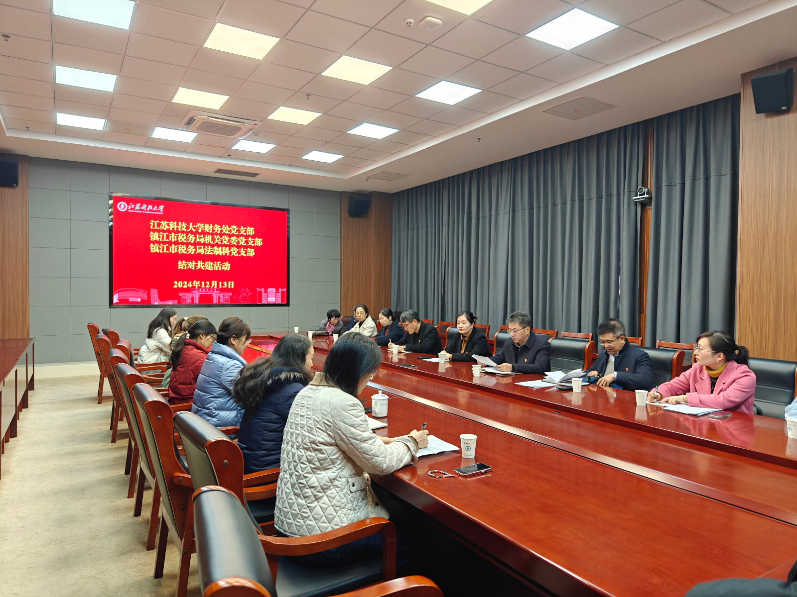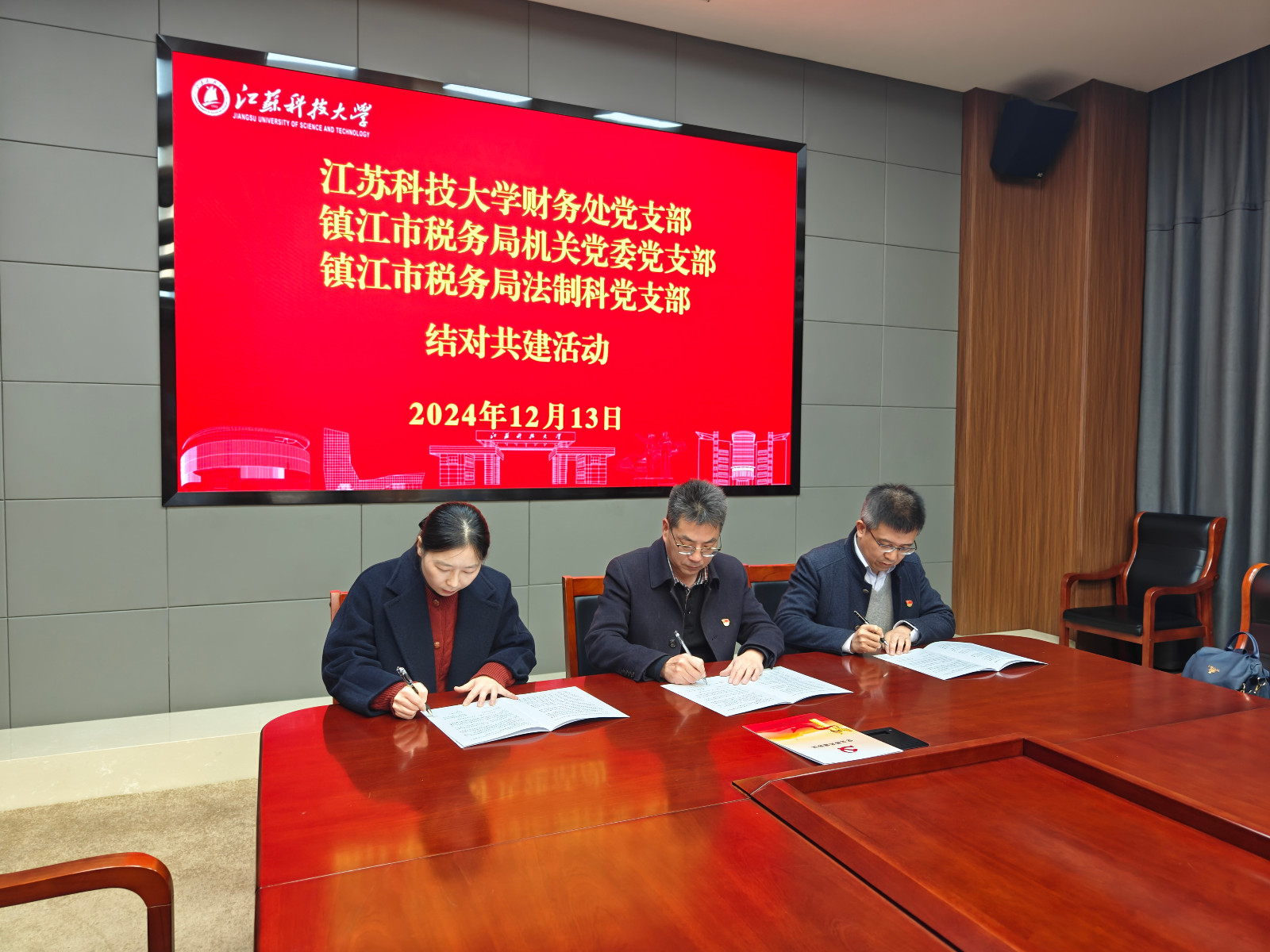 12月13日,学校财务处党支部与镇江市税务局机关党委党支部、法制科党支部在长山校区行政楼200号会议室开展支部共建活动,活动由财务处党支部书记江建蓬主持。镇江市税务局党委委员、总经济师刘青出席活动。双方全体党员共同参加了支部共建协议签署仪式。