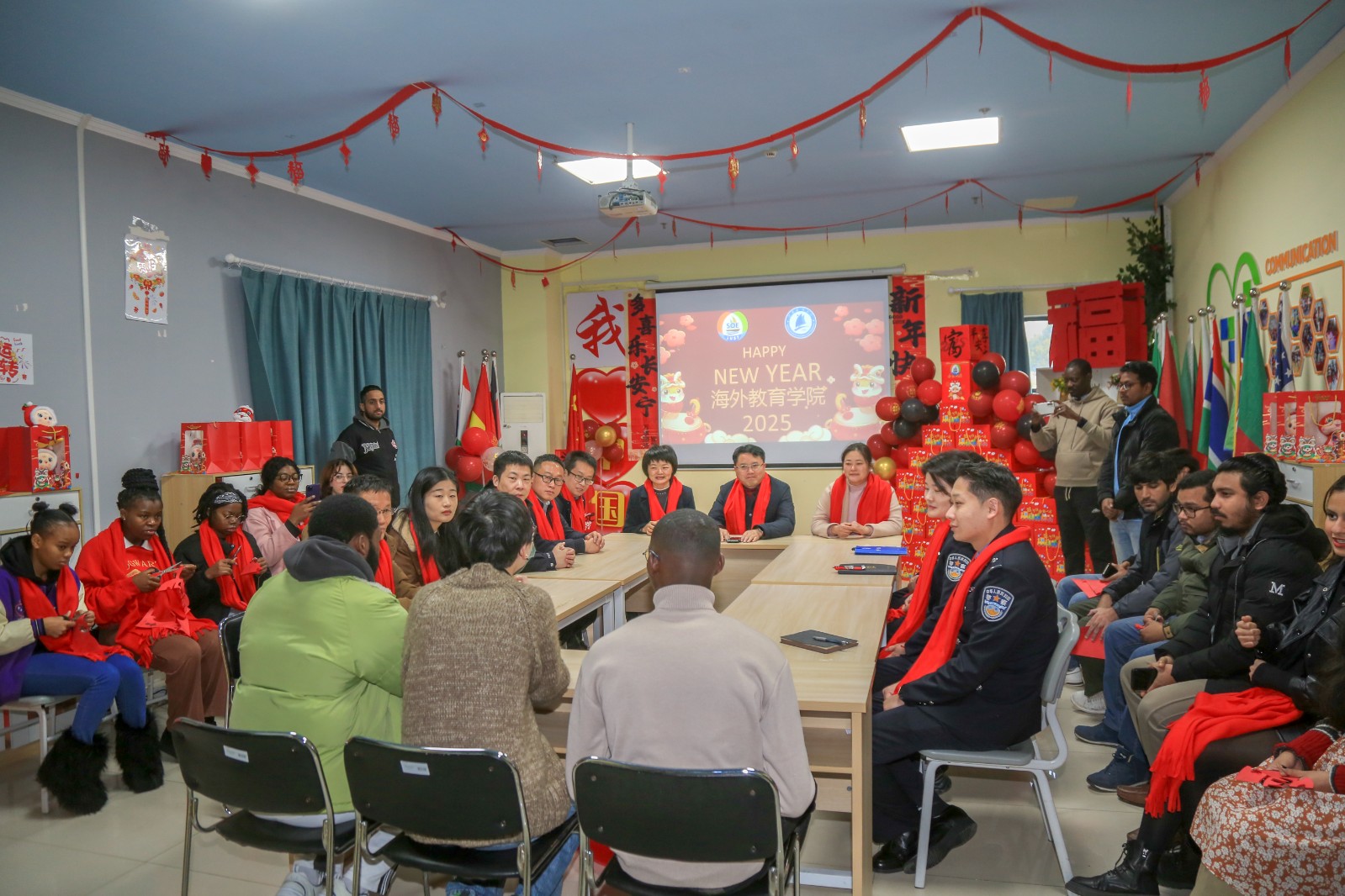 活动在一片热闹非凡的氛围中拉开序幕。周宏根代表学校向来华留学生们送上新春祝福。他赞扬了留学生们过去一年的辛勤努力,并鼓励他们继续珍惜在华学习的宝贵机会,不断提高汉语水平和专业能力,为中外文化交流贡献个人力量。随后,周宏根亲手向留学生们赠送了寓意吉祥的蛇年吉祥物,并叮嘱相关部门和管理人员要时刻关心关爱留校留学生的生活和学习,做好境内留学生的假期管理和服务工作。