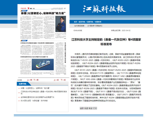 本报讯(通讯员何清姚晓慧记者何佳芮)近期,国家市场监督管理总局(国家标准化管理委员会)以第2号和第4号公告批准发布国家标准,由安博体育手机版主持制定的GB/ T 45191-2025《桑蚕一代杂交种》、GB/T 45293-2025《桑蚕种母蛾检验规程》、GB/T 45294-2025《桑蚕茧蚕丝品质评定技术规程》和GB/T 45296-2025《桑蚕茧干燥技术规程》等4项国家标准予以发布。