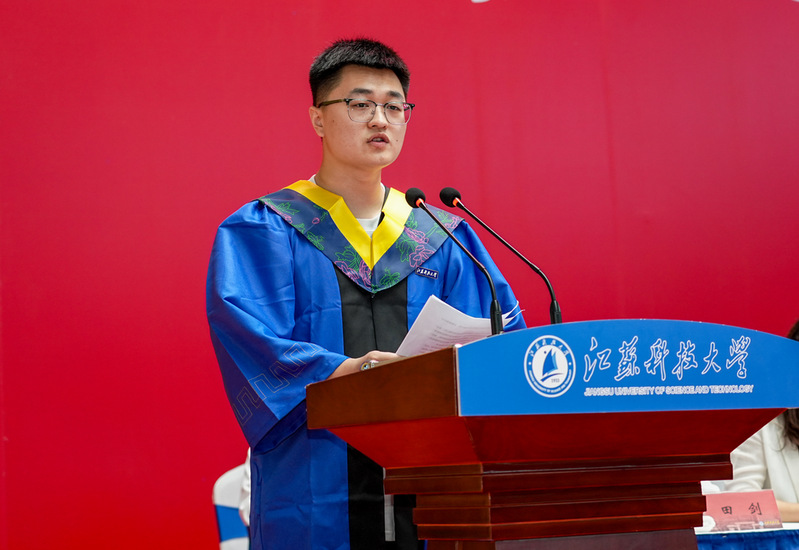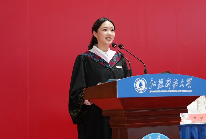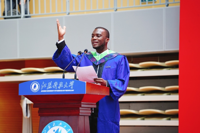 仪式见证成长,感言彰显担当。本科生代表、人文社科学院刘祎昕同学表示要勇敢在人生的航道上乘风破浪;留学生代表、来自科特迪瓦的乔纳森同学用标准的普通话深情感谢母校培养;硕士生代表、能源与动力学院沈钰同学分享了践行兴船报国理想的无限展望。