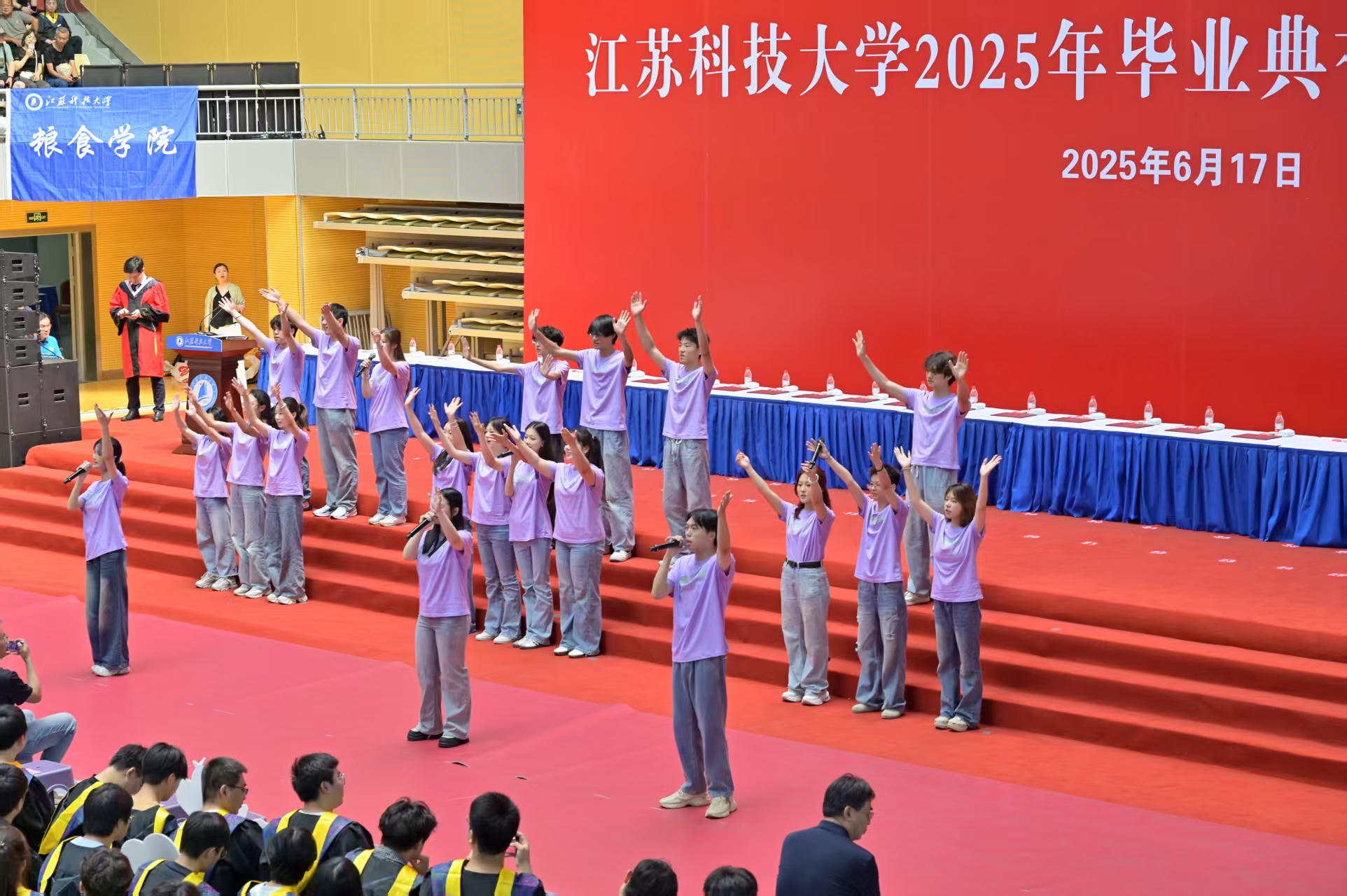 8点30分,在庄严的国歌声中,毕业典礼盛大启幕。主会场设镇江大学城共享体育馆,张家港校区设视频分会场。学校官方微信视频号、B站、抖音、微博等平台同步直播,师生校友“云端”观礼,共襄青春盛典。